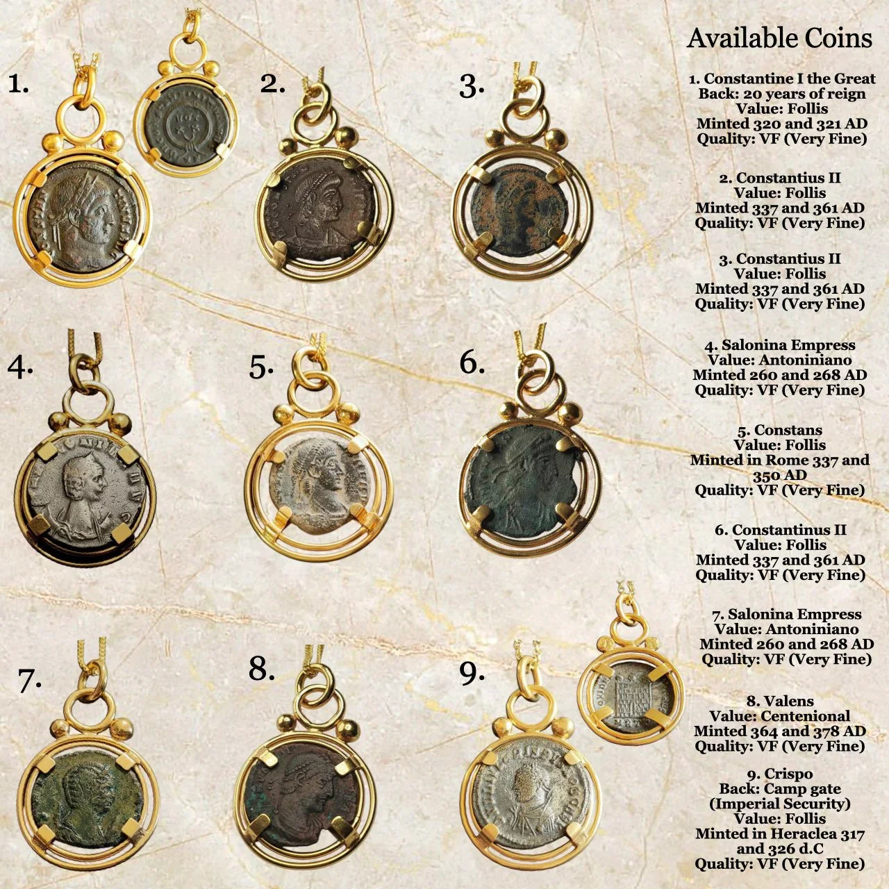 Colgante fabricado a mano con una moneda romana auténtica. El colgante se entrega acompañado de un certificado de autenticidad de la moneda garantizado por un numismático profesional.