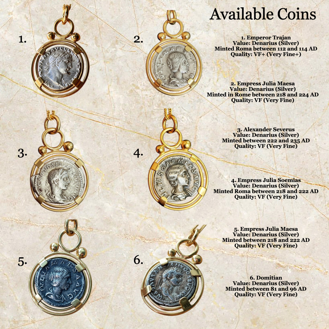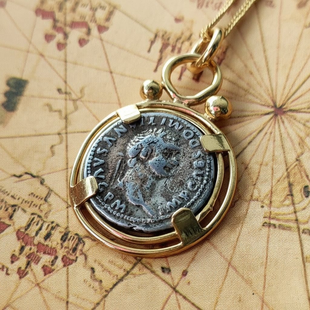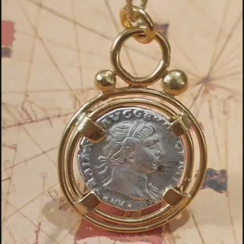 Colgante fabricado a mano con una moneda romana (denario de plata) auténtica. El colgante se entrega acompañado de un certificado de autenticidad de la moneda garantizado por un numismático profesional.